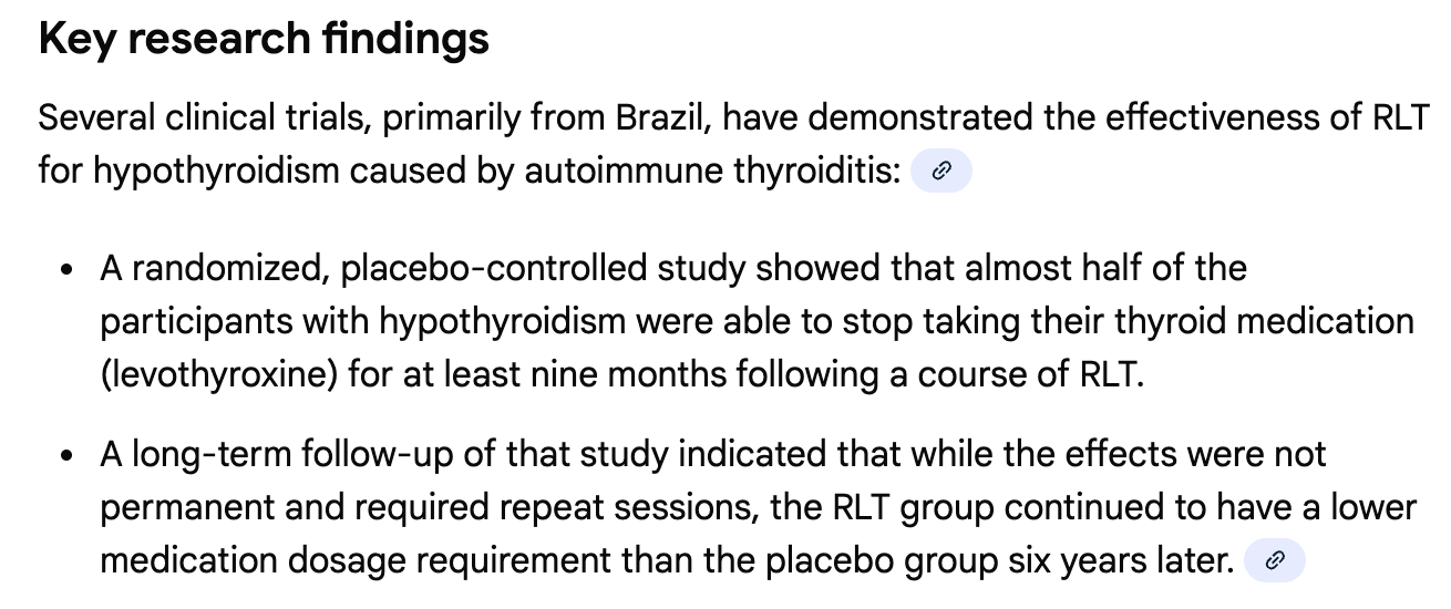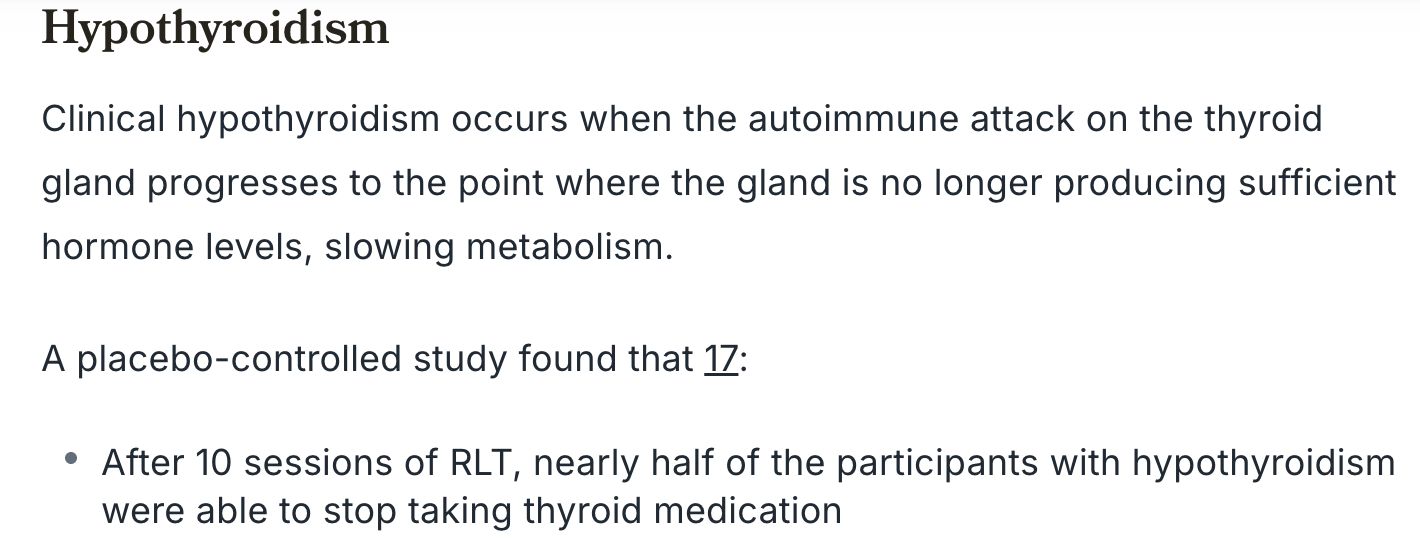 When they put the 17 participants to test half of the participants with hypothyroidism were able to stop taking their medication after 10 sessions of red light therapy. Take a look at the source below: