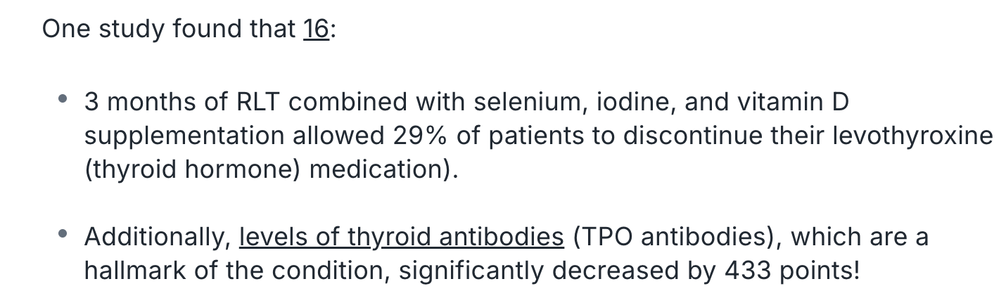 Another study showed that Red Light therapy combined with Selenium, Iodine, and Vitamin D supplementation allowed 29% out of 16 patients put to the test to discontinue their medication.